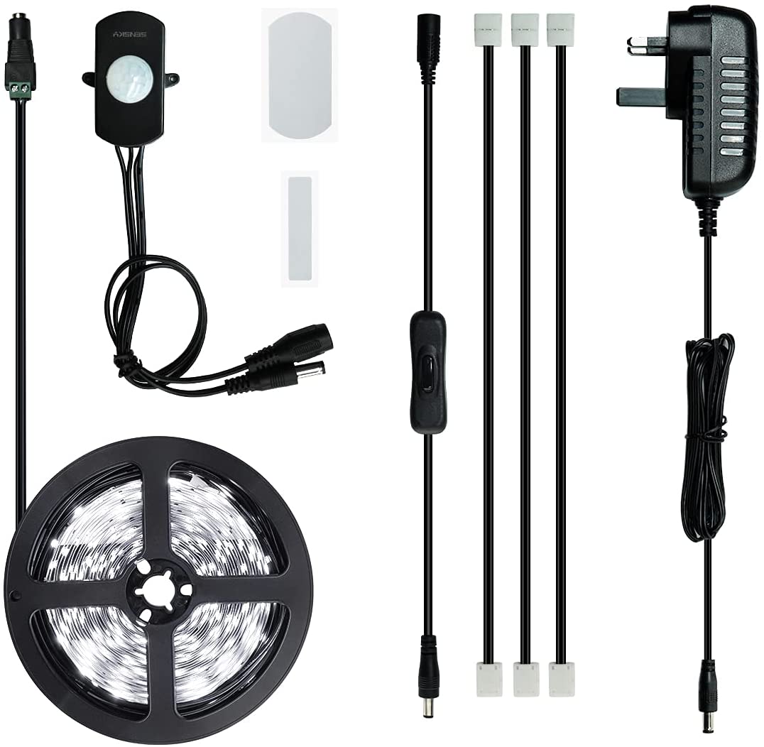 Sensky人体感应LED灯带配备明亮的冷白色温,可裁剪且可连接的铜板,特别适合橱柜下灯、门框,自动开关。也可用作床头灯、衣柜灯等。现在就DIY你喜欢的风格,最长3米。