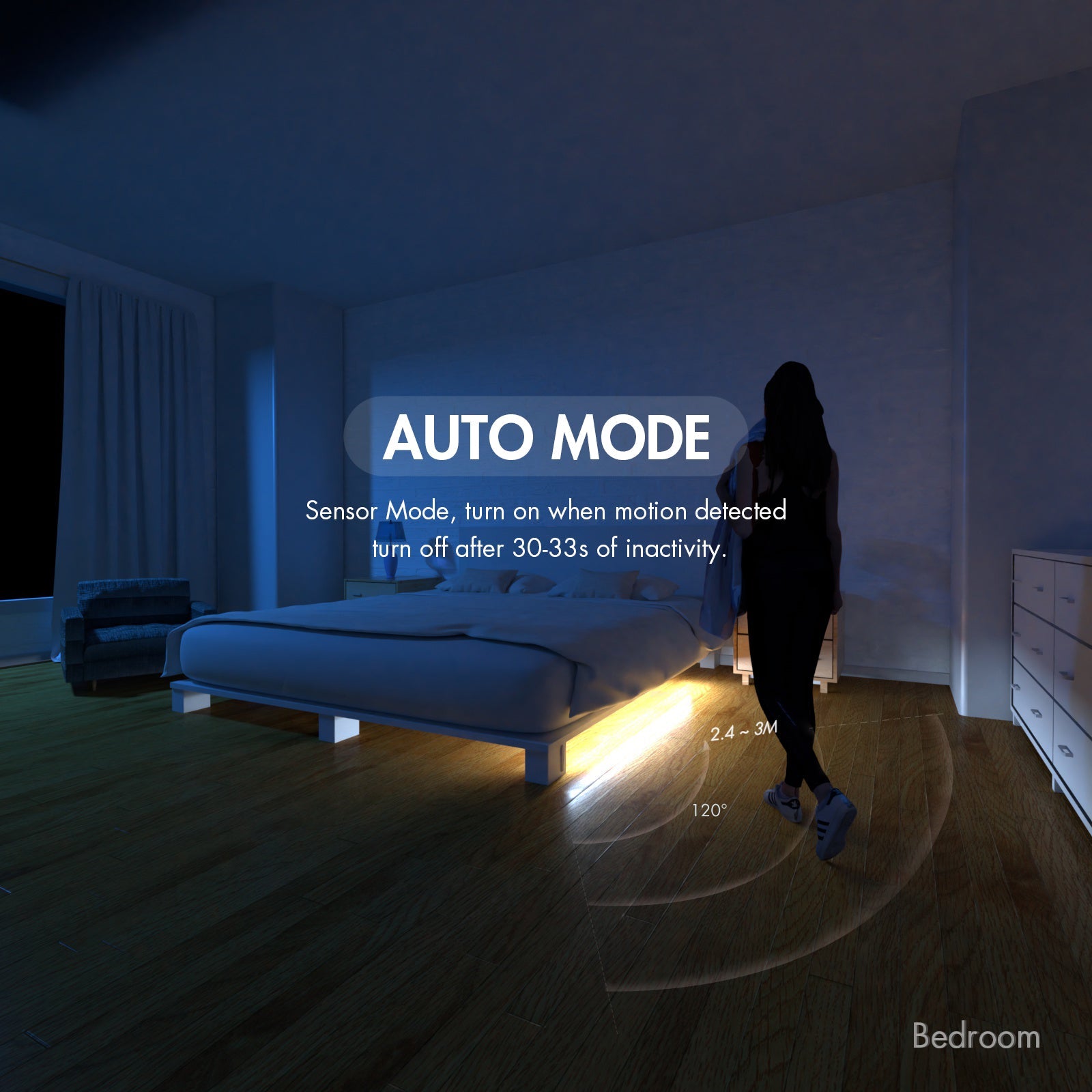 - 感应模式 & 手动开关:作为感应灯带工作,自动通过检测运动(或热源)开/关。手动开关模式也允许您将灯带作为普通灯带使用。